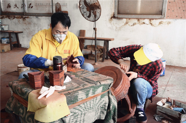 我已經(jīng)在打磨車間“貓”了一天。因為區(qū)錦澤告訴我,這個車間有很多工匠都是夫妻,通常都是夫妻搭檔打磨同一件家具或者同一套家具,丈夫力氣大,做刮磨,妻子心細,做打磨,你會經(jīng)常發(fā)現(xiàn)有些夫妻打磨打磨著就越靠越近,特別恩愛。這聽起來非常有愛的畫面,當然要“偷偷地”去看看。