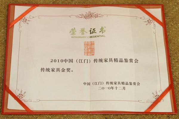 2010年區(qū)氏臻品獲傳統(tǒng)家具金獎(jiǎng)