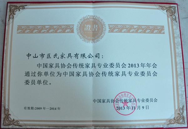 2013年11月區(qū)氏臻品榮獲中國(guó)家具協(xié)會(huì)傳統(tǒng)家具專業(yè)委員會(huì)會(huì)員稱號(hào)