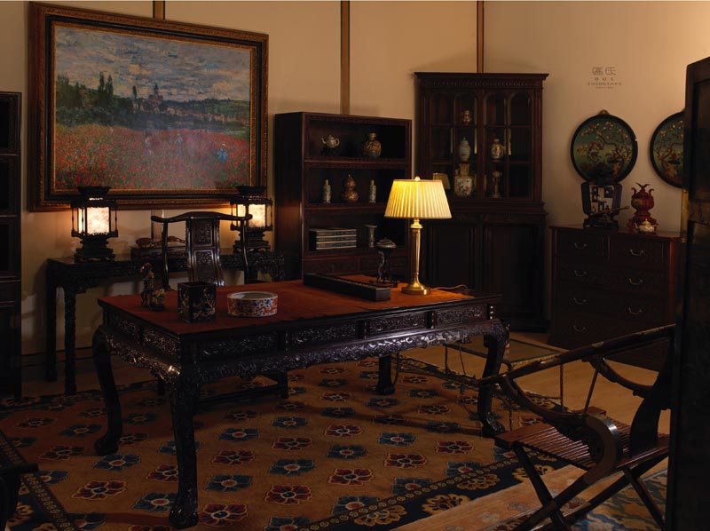 正中一張紫檀高束腰三彎腿畫桌,桌前設(shè)一張圓靠背交椅,主人座是一張紫檀四出頭官帽椅子,靠墻放著一對紫檀亮格書柜,這樣的布局是彰顯中國儒家之道,修身齊家,心懷天下。